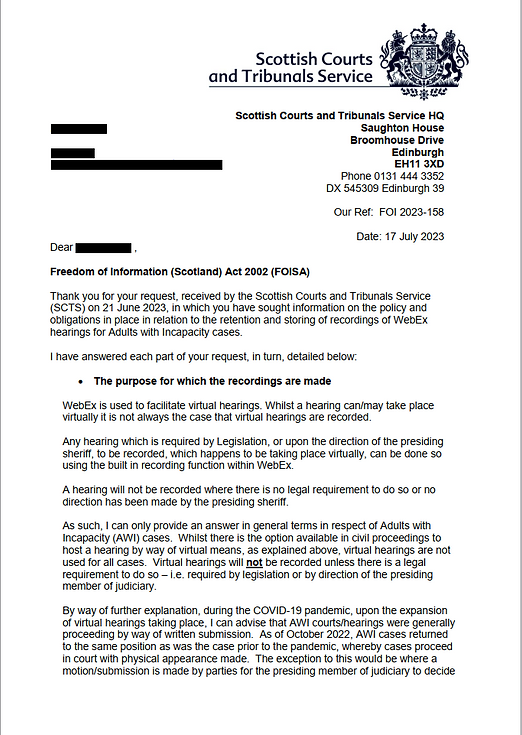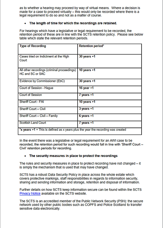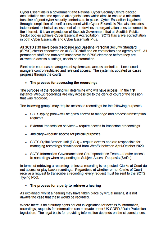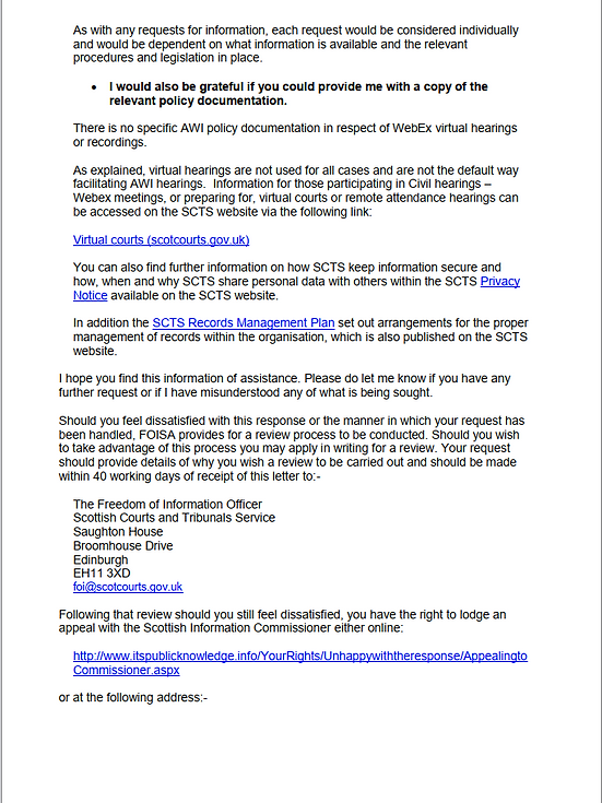 | This FOI was obtained from the SCTS in relation to recording Webex Trials. It shows that there is no requirement to record these sessions unless the judge deems it appropriate | ![]() ![]() ![]() ![]() ![]()  |